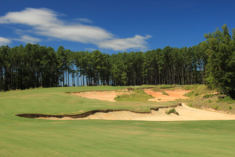 First, we view the par-3 8th at Tobacco Road (Sanford, NC | Opened 1999). You'll immediately spot the similarities to Raynor's work at CC of Charleston above. It lacks the fine edges and endless sea of short Bermuda grass, but it wouldn't be Strantz if it had it.